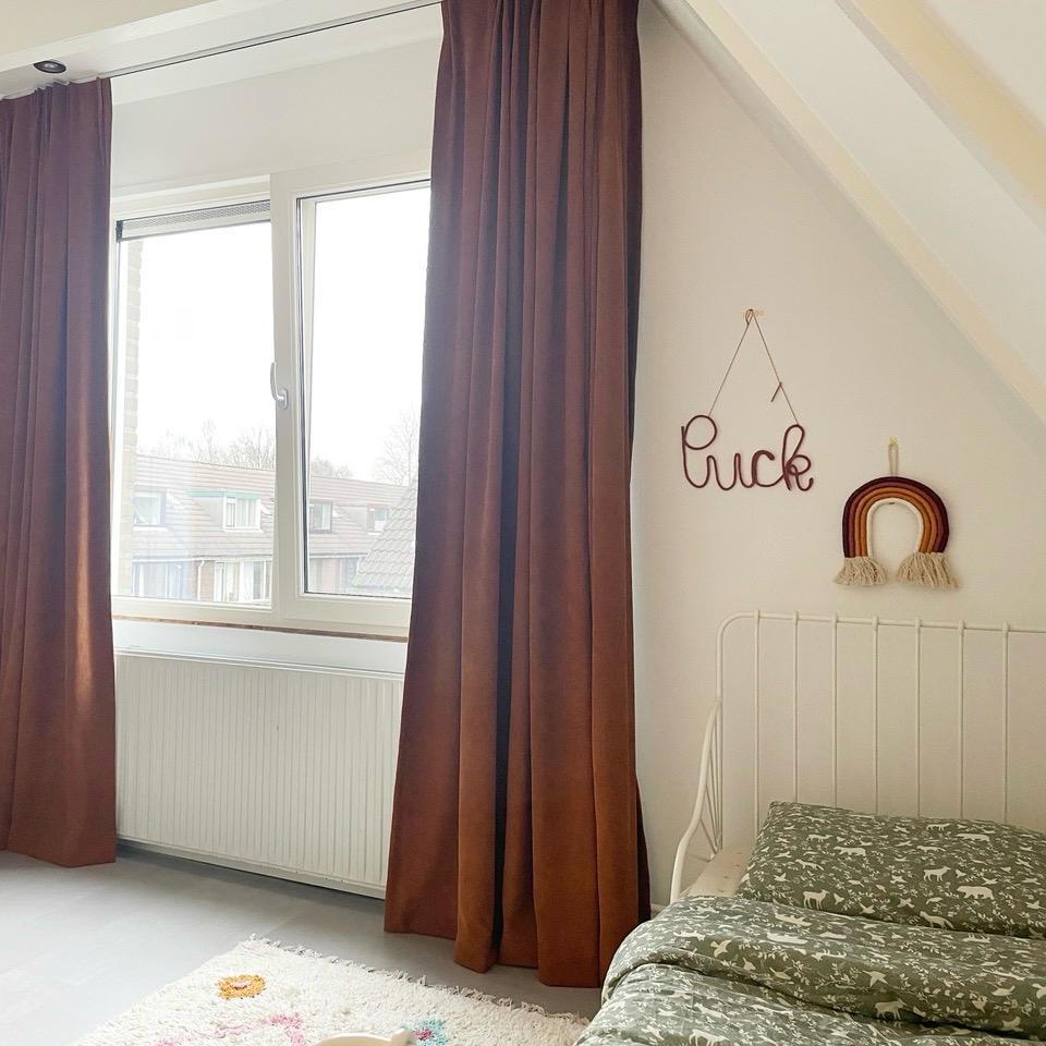 Gordijnen in de stof Rib roest met een verduisterende voering. De gordijnen zijn gemaakt met een enkele plooi en een iets langere lengte zodat de gordijnen op de grond 'staan'.